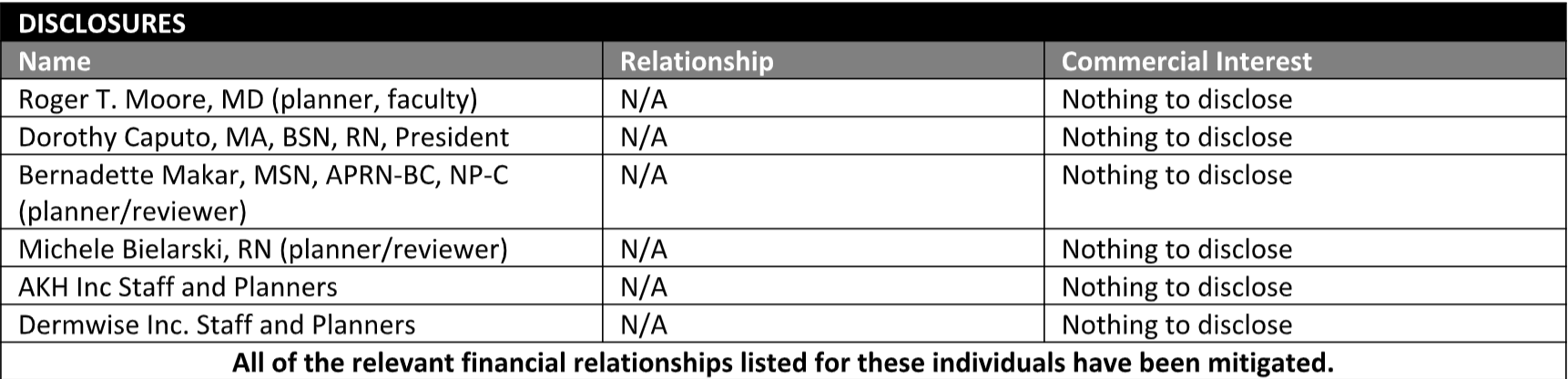 It is the policy of AKH Inc. to ensure independence, balance, objectivity, scientific rigor, and integrity in all of its continuing education activities. The author must disclose to the participants any significant relationships with ineligible companies whose products or devices may be mentioned in the activity or with the commercial supporter of this continuing education activity. Identified conflicts of interest are mitigated by AKH prior to accreditation of the activity. AKH planners and reviewers have no relevant financial relationships to disclose.